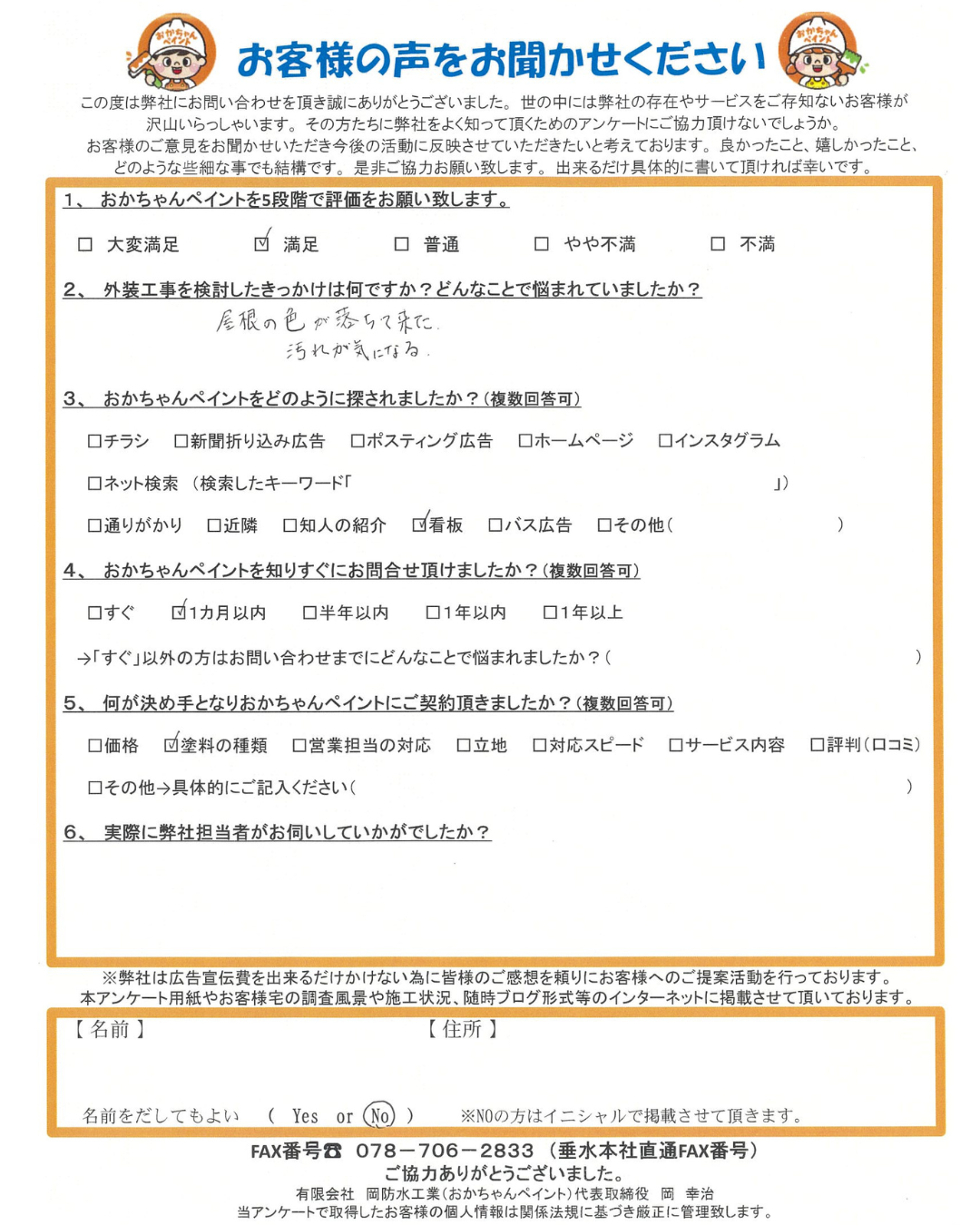 「屋根の色が落ちて来た」ためお問合せくださった神戸市西区K様よりアンケートをいただきました~ご契約後アンケート~