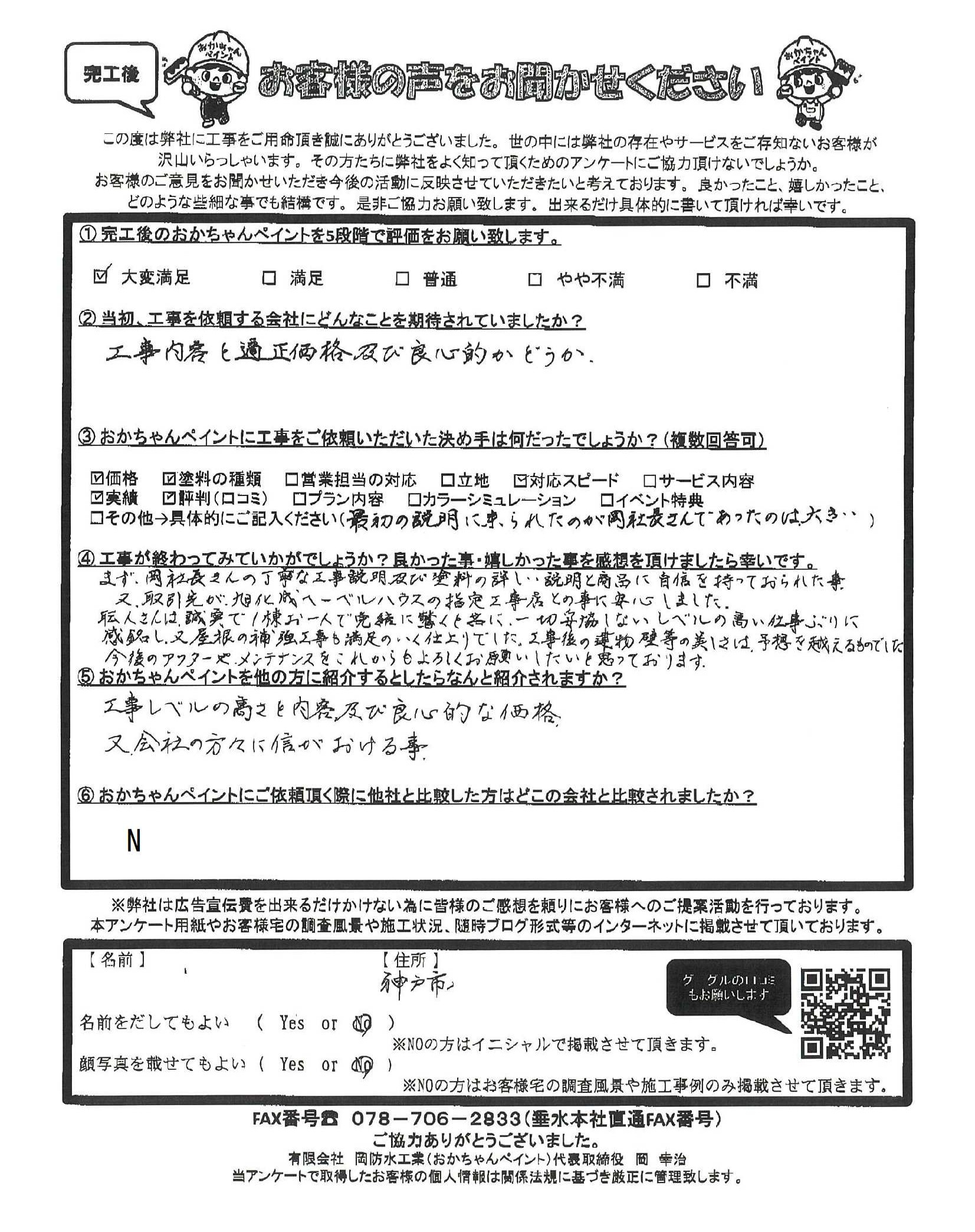 神戸市垂水区K様邸より、「岡社長の説明と誠実な職人仕事に安心」お声を頂きました~完工後アンケート~